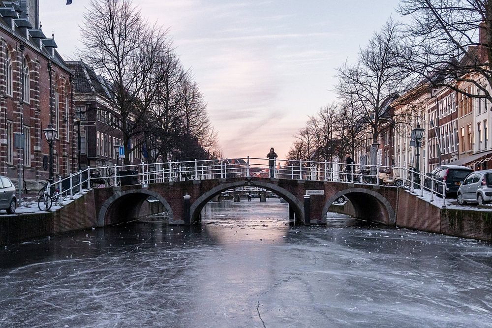 To the left, Leiden University building stretches out while a single person walks across the bridge, adding a sense of scale and movement to the tranquil scene. The photo exudes an enchanting serenity, in which the winter atmosphere and historical architecture come together to form a picturesque whole.