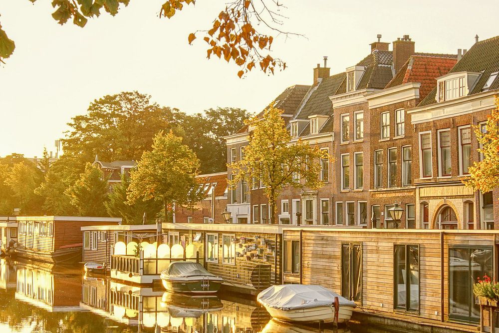 Leiden canal in the early morning with beautiful reflection of the water and the rising sun. Leaves are already turning into autumn shades and the early sunlight makes it complete.