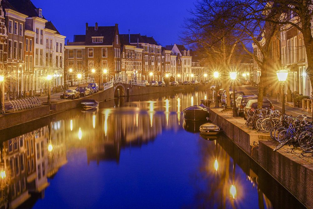 De stad Leiden in de vroege morgen op één van de vele mooie plekjes. De spiegelingen in het water, de karakteristieke lantaarns, bruggetjes en fraaie gevels maken het Leiden steeds weer tot een sprookje.