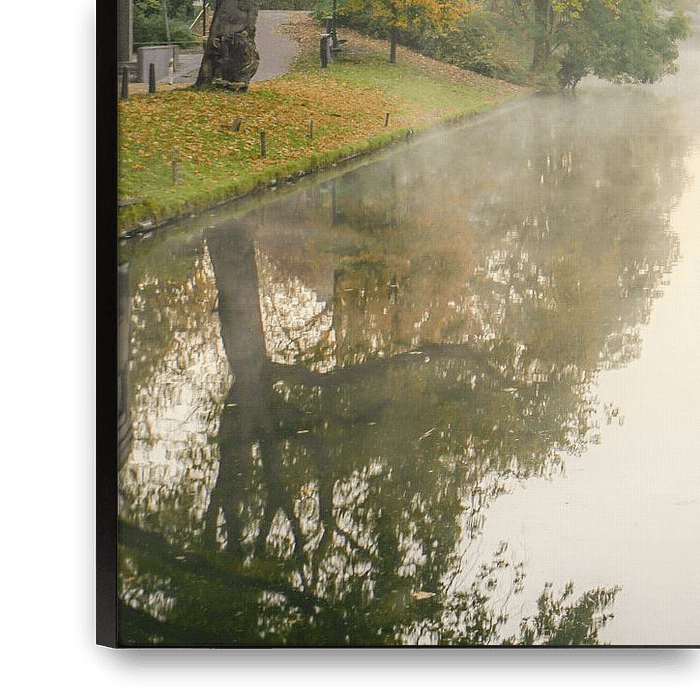 Leidse gracht in de vroege morgen met mooie spiegeling van het water en de opkomende zon. Bladeren verkleuren al naar herfsttinten en het vroege zonlicht maakt het af.