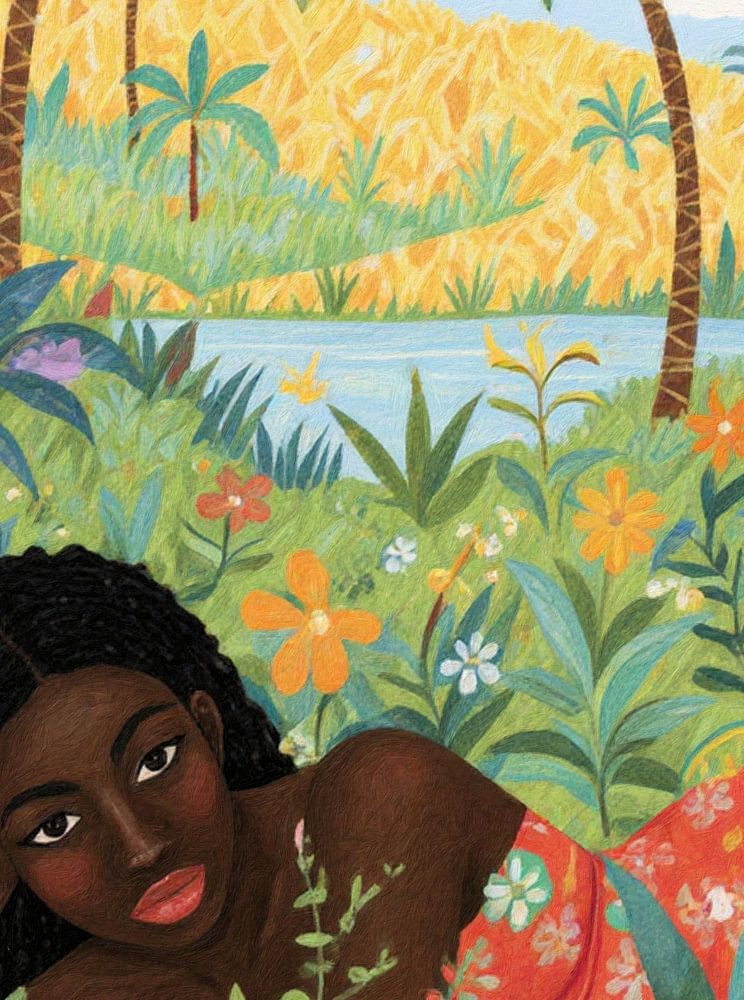 This colourful artwork shows the portrait of a serene, stylish woman relaxing amidst a vibrant, dense tropical garden full of palm trees, various flowers and lush foliage. This illustrative piece is ideal for clients looking for striking, modern art with an exotic…