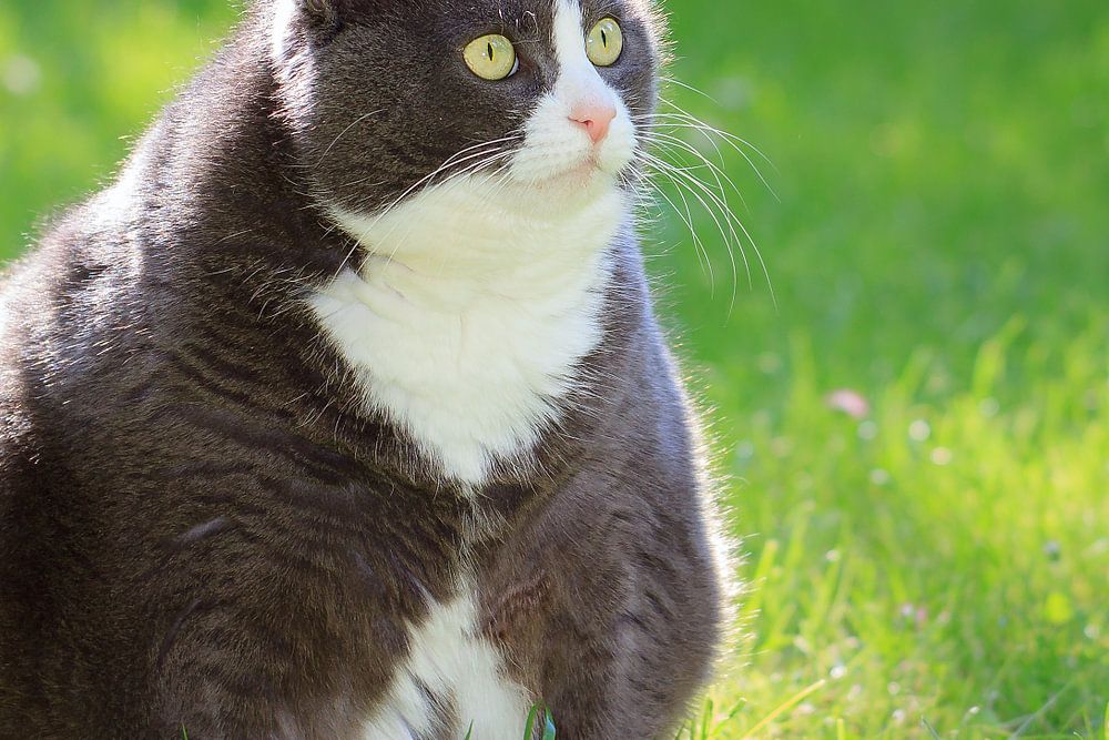Prachtige opname van een lekkere dikke kat op het gras in de tuin in de lente, wie wil dat nou niet aan de muur!