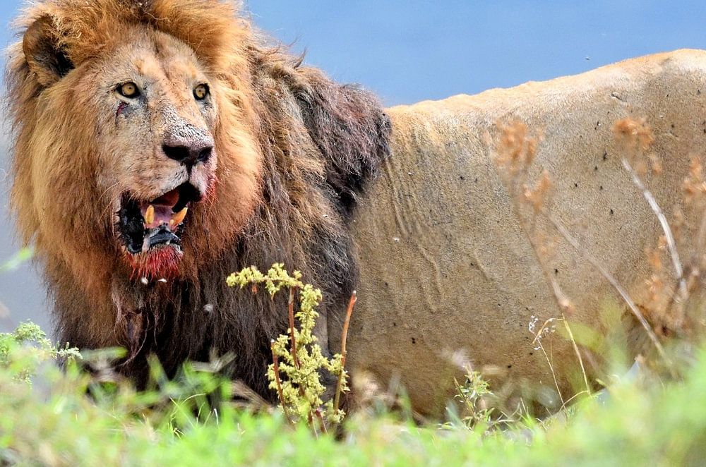 A male lion with a bloody mouth ... wildlife in the Ngorongoro Crater in Tanzania.