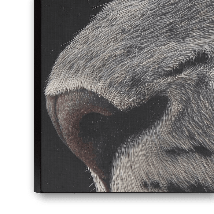 This hyper-realistic close-up shows the profile of a leopard with stunning attention to detail. The texture of the fur, the subtle shadows between the black rosettes and the gleam in the amber eye create a sense of intense presence and acuity. The dark background shows off the animal to its full advantage, while the emphasis on the eye conveys a sense of strength and alertness. A masterful portrait for interiors that love wildlife art, refined realism and visual intensity.