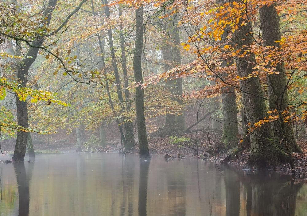 The Leuvenum brook meanders through the beautiful misty autumn colored forest! Because of the rain the water is very high and the trees stand with their feet in the water. The reflection in the water is like a mirror.