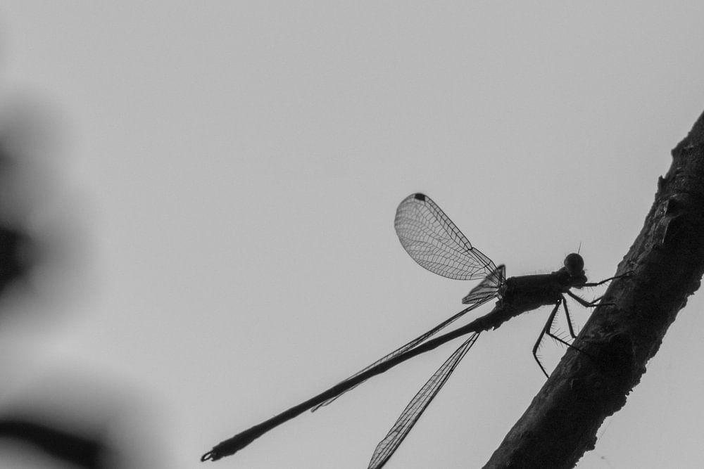 The dragonfly on a branch in a black and white photo. The facets of the wings are clearly visible as well as its small head antennae. The image has an "out of this world" look.
