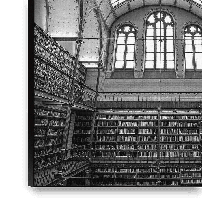 Black and white photograph of the library in the Rijksmuseum in Amsterdam. A lot of light is let in through the glass roof.