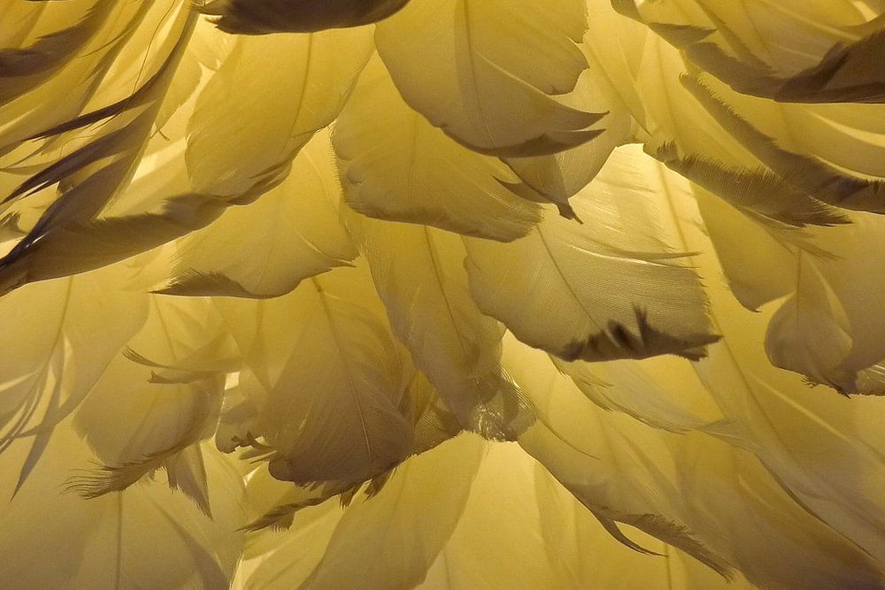 De verlichte veren maken onderdeel uit van een hanglamp. Foto is gemaakt in een winkel in België.