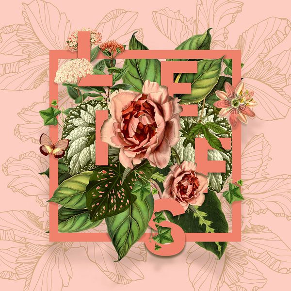 'Liefs' in Botanical elements with pink frame by Behindthegray