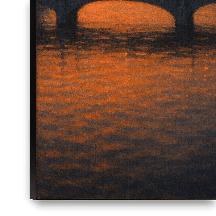 Buy this landscape artwork Liège at Dusk – Industrial Bridges in Amber Reflection by Travel Shop on canvas, ArtFrame, poster and wallpaper, printed on demand in high quality.