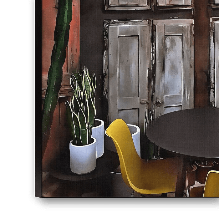The saying goes that you never know what goes on behind closed doors. The same is perhaps true for life behind closed shutters. In this photo art image, we see four old internal wooden panel shutters, closed shut making a dark area inside a room. A round wooden table sits immediately in front of the shutters but three bright yellow plastic chairs and some white flower pots with cacti light the space.