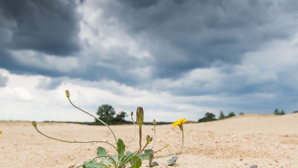 Kootwijkerzand is a drifting sand area. Not just one, but the largest in Western Europe. The sandy area is part of the Veluwe. Little vegetation can be found in this area, some fly pines and grasses survive the dry and poor soil. This little flower was the only one in the distant area as a bonus a hoverfly . The threatening sky with later thunderstorms completes the picture.
