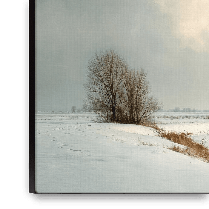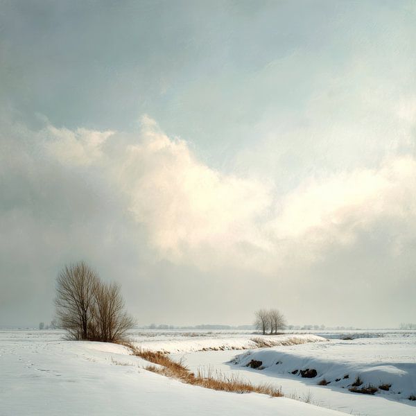 Under a high, softly coloured sky, a silent winter landscape unfolds in which snow and light embrace each other. A winding stream cuts through the white field and leads the eye to the horizon, where bare trees stand in the distance like fine brushstrokes. The clouds break open and let through a warm glow that softens the cool blue of…