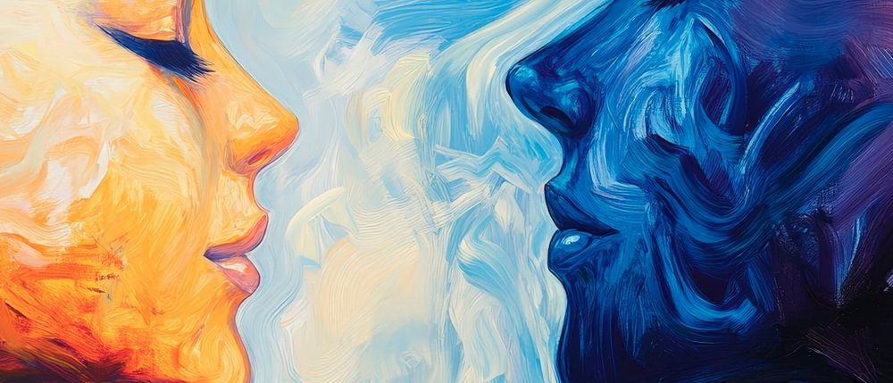 A fascinating duel of the elements: radiant yellow meets deep blue, while two soulmate faces meet in tender closeness. The harmonious colour composition and emotional expressions create a captivating atmosphere. Ideal for the bedroom, where they promote a romantic and relaxing environment. An eye-catcher that invites you to dream.