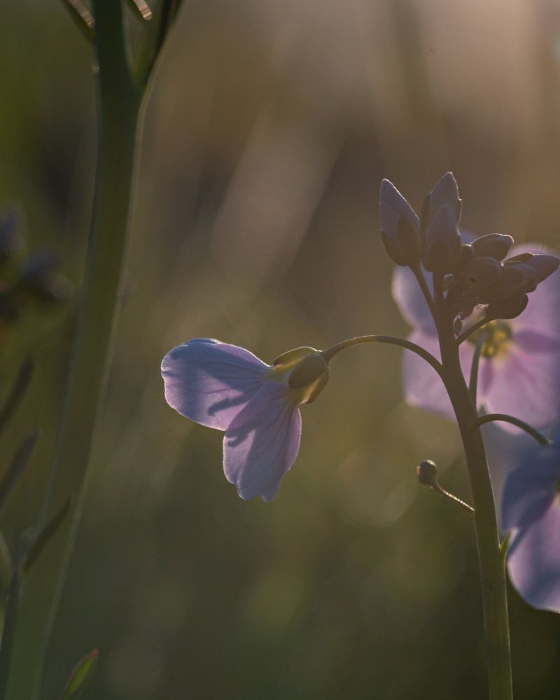 A subtle meeting of light and bloom: the purple flowers are bathed in the warm, low sunlight of an early morning or late afternoon. The backlight highlights their transparency and softness, while the silhouette of the plants adds a graphic element.