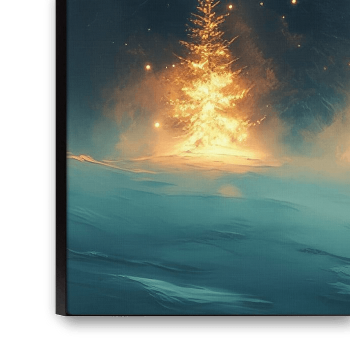 This enchanting winter landscape shows a row of illuminated pine trees shining in a dark, snowy setting. The warm golden lights create a beautiful contrast with the icy blue snow and dark trees in the background, evoking an almost magical atmosphere. The soft glow around the trees seems to break the silence of a winter evening, bringing a sense of warmth and joy to the cold night. Perfect for lovers of atmospheric winter decoration, this artwork adds a festive touch to any interior.