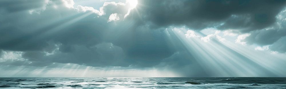 This image is one from a larger series. The images show a beach landscape with dunes and waving grass. The play of light from the sun between the clouds creates a dynamic shadow and light effect over the sand and sea. The waves gently roll onto the beach, while the sky is filled with soft clouds through which sunbeams shine. The scene exudes a sense of tranquillity and natural beauty, focusing on the harmonious interplay of light and shadow in the coastal landscape.
