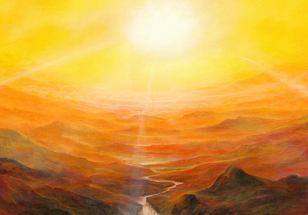 Overall, this painting perhaps expresses contemplative immersion, reverence and gratitude for the sun and the beauty of life. It invites the viewer to feel and be filled with the life-giving energy and inspiration of the sun. It reminds us that the sun is not only a celestial body, but also a source of hope, joy and zest for life.