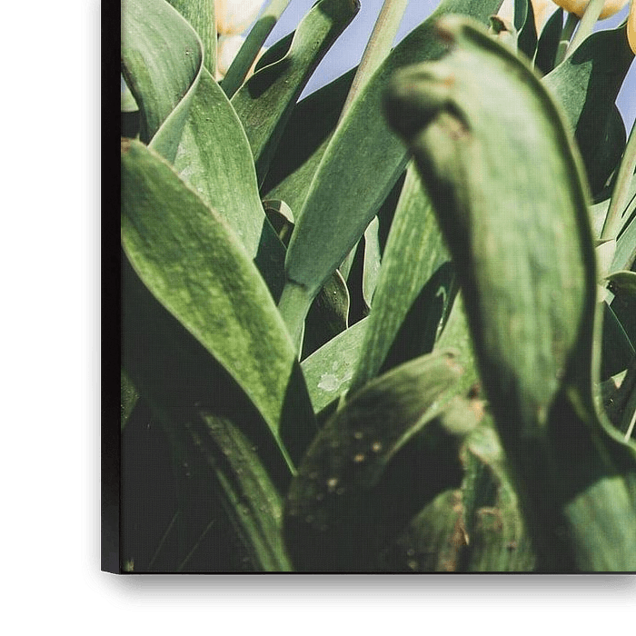 Buy this landscape artwork Light yellow tulips against a blue sky by Expeditie Aardbol on canvas, ArtFrame, poster and wallpaper, printed on demand in high quality.