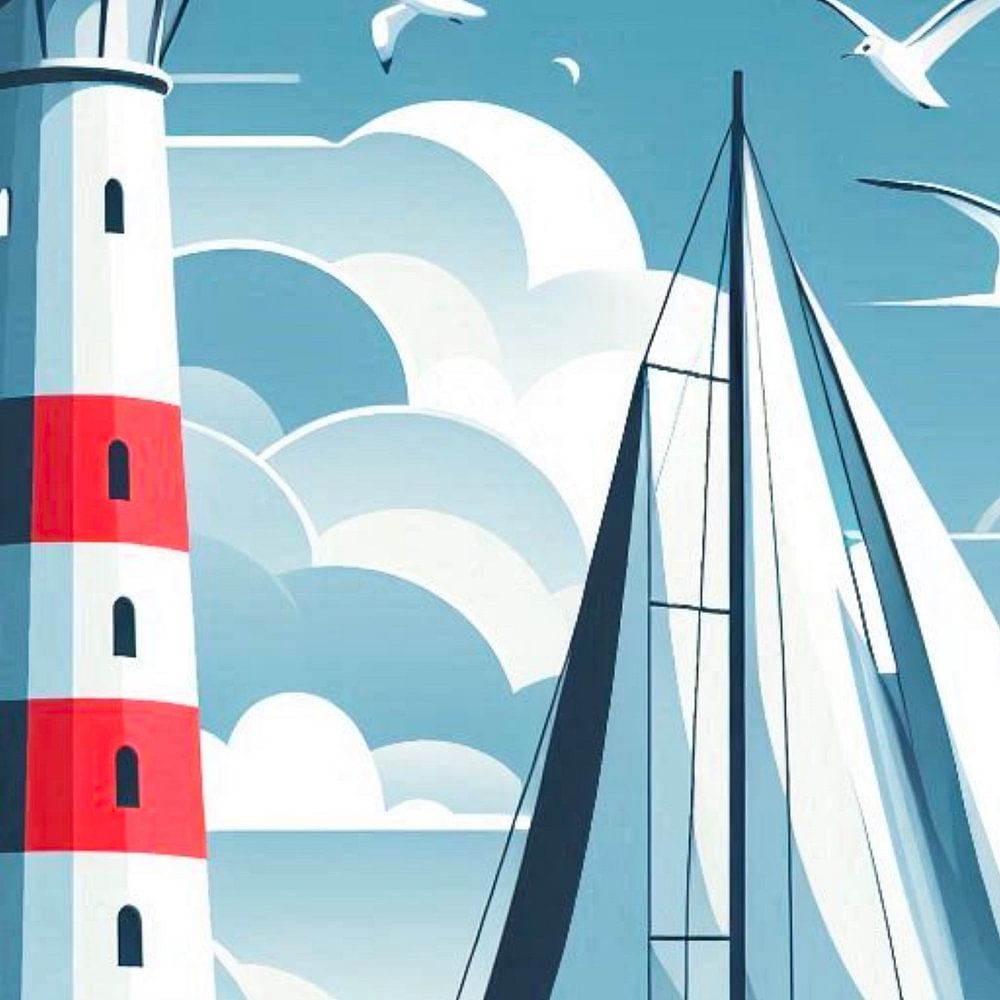 A lighthouse and a sailboat. The boat sails across the water and sails quietly past the lighthouse. What a beautiful peaceful picture.