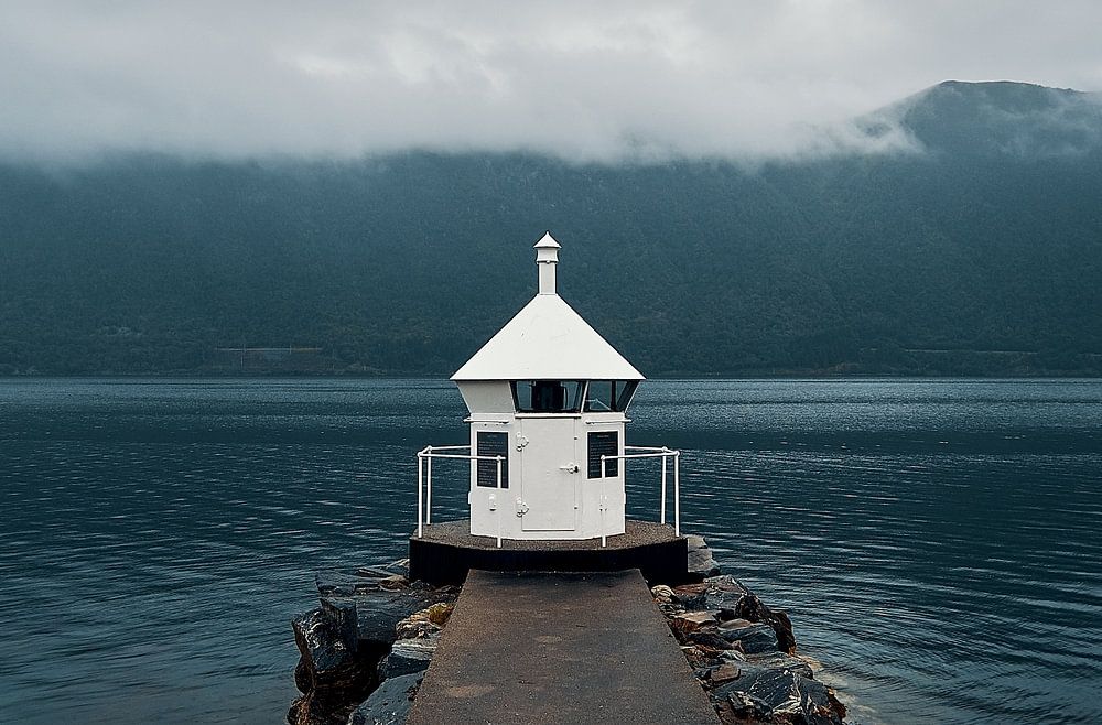 Lighthouse in a fjord on a rainy day, Norway by qtx