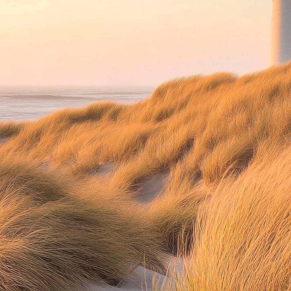 Gentle waves of golden grasses dance in the wind, while a gleaming white lighthouse sits proudly in the background. The soft pastel colours of the sunset kiss the horizon, and the tranquil coastal landscape conveys a peaceful stillness that embraces the soul and spirit. A place where time seems to stand still, trapped in a picturesque dream.