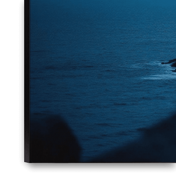 In soft twilight colours, the lighthouse rises majestically above the roaring sea. Its warm light radiates confidence as the waves lap gently against the rocky shore. This nostalgic scene invites you to dream and would make a wonderful addition to a cosy living room or an inspiring study.