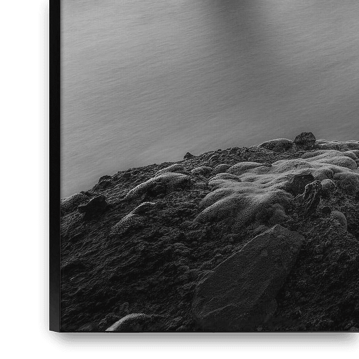 Buy this landscape artwork Lighthouse on Iceland with cliffs by the sea in black and white. by Manfred Voss, Black-White Photography on canvas, ArtFrame, poster and wallpaper, printed on demand in high quality.