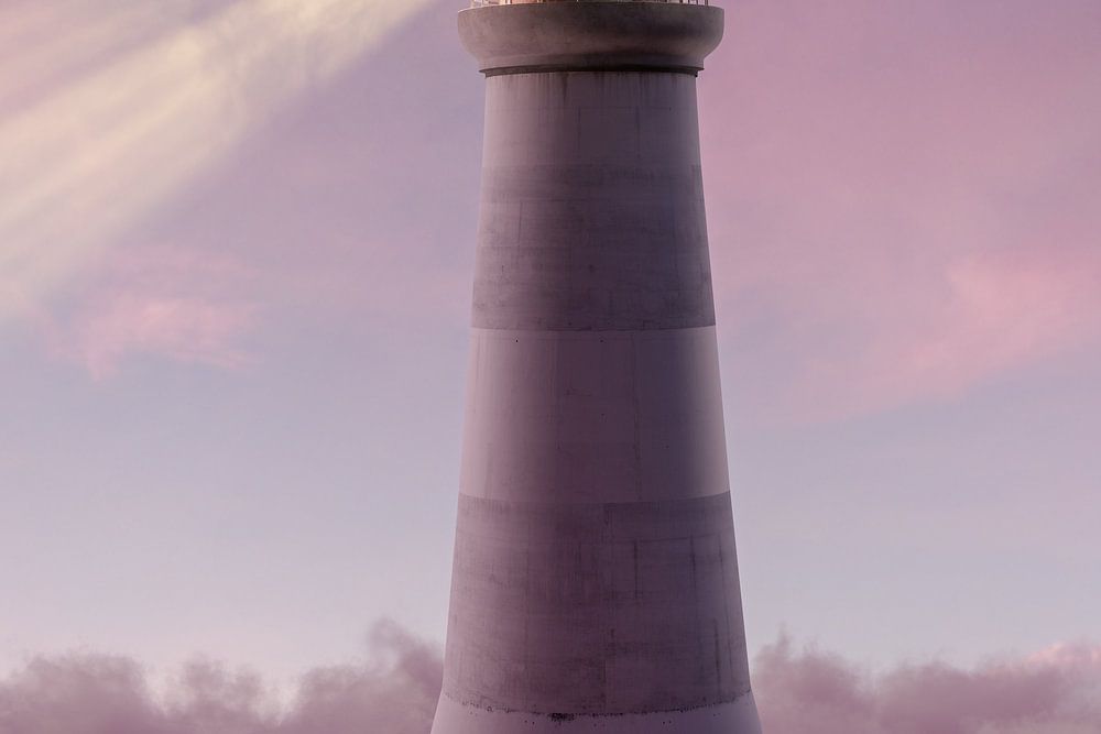 Lighthouse with light on over pink clouds in evening mood by Besa Art
