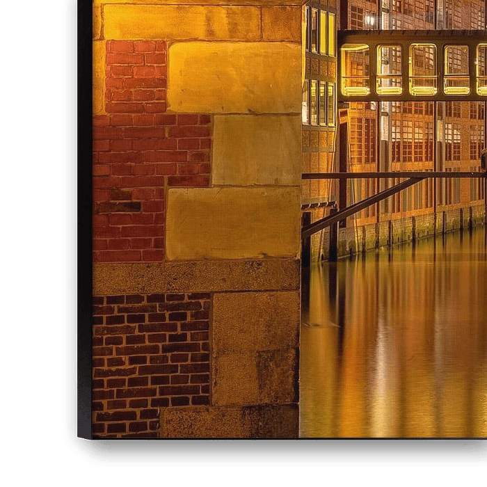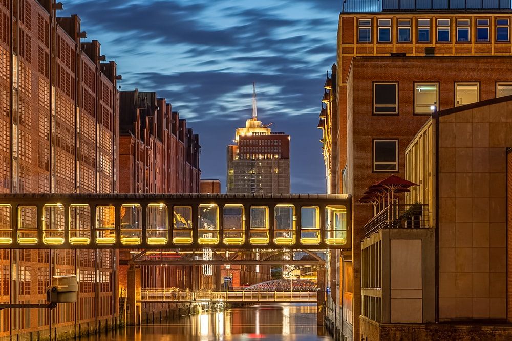 A night-time view of Hamburg's Speicherstadt warehouse district: warm lights are reflected in the calm waters of Brooksfleet, while the glass transition between the historic brick façades acts like a glowing pulse of the city. In the background, the tower rises like a silent guardian over the urban fairytale.