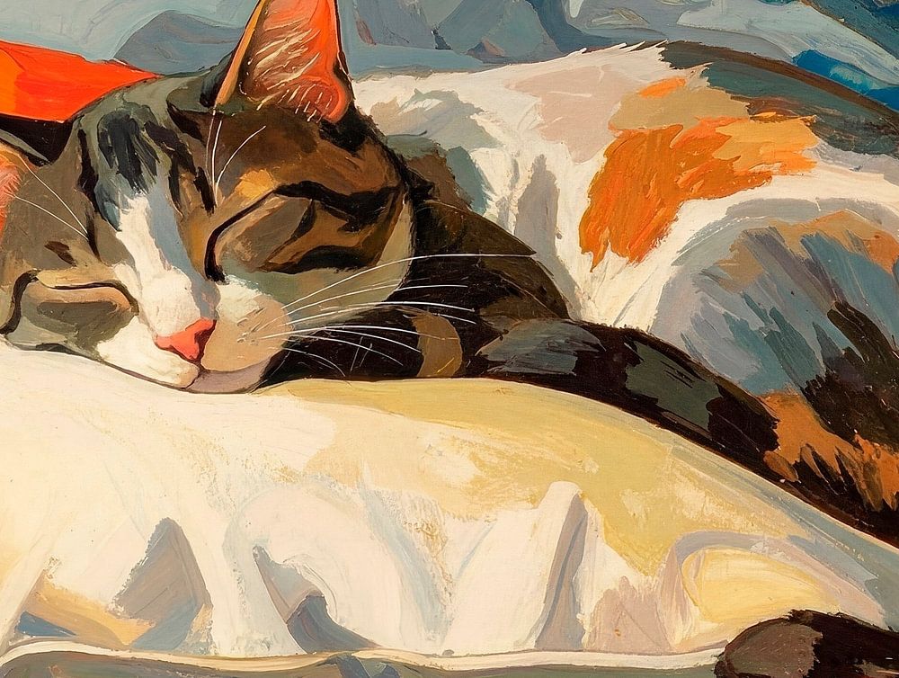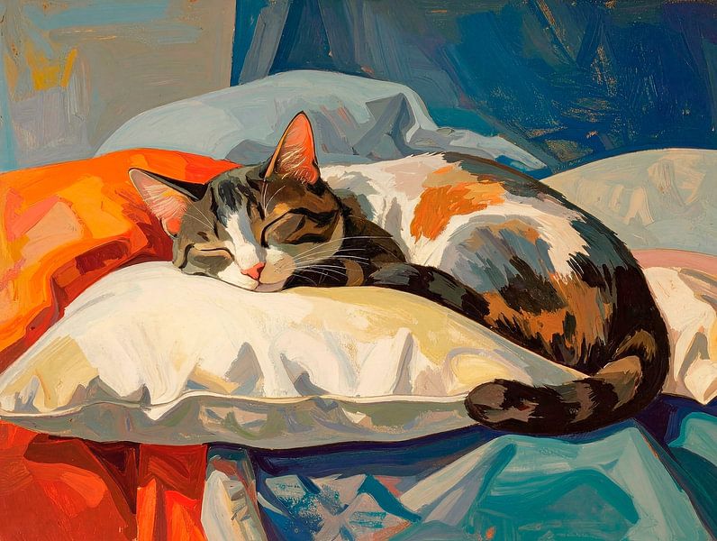 A cat sleeping on a cushion on an unmade bed. A lovely photo. Because of the light, the colours, the unmade bed, the cool look and, above all, the expression on that little face. It’s enough to make you swoon.