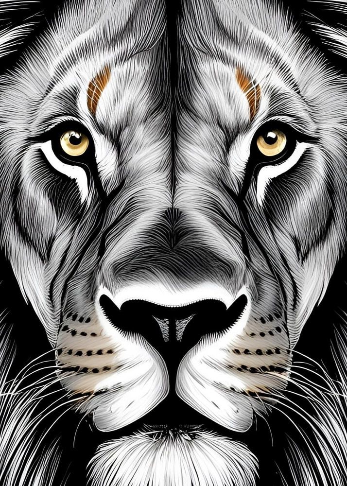 The image showcases a detailed illustration of a lion's head, rendered in black and white with accents of gold. The lion's mane is thick and flowing, framing its intense gaze. Its eyes are a striking yellow, adding a touch of color to the otherwise monochrome palette. The lion's nose and mouth are meticulously drawn, capturing the animal's powerful presence.