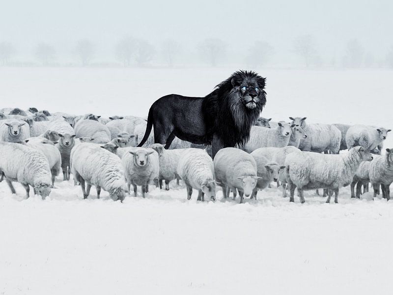Buy this lion art Lion among sheep by Sascha Hahn on canvas, ArtFrame, poster and wallpaper, printed on demand in high quality.