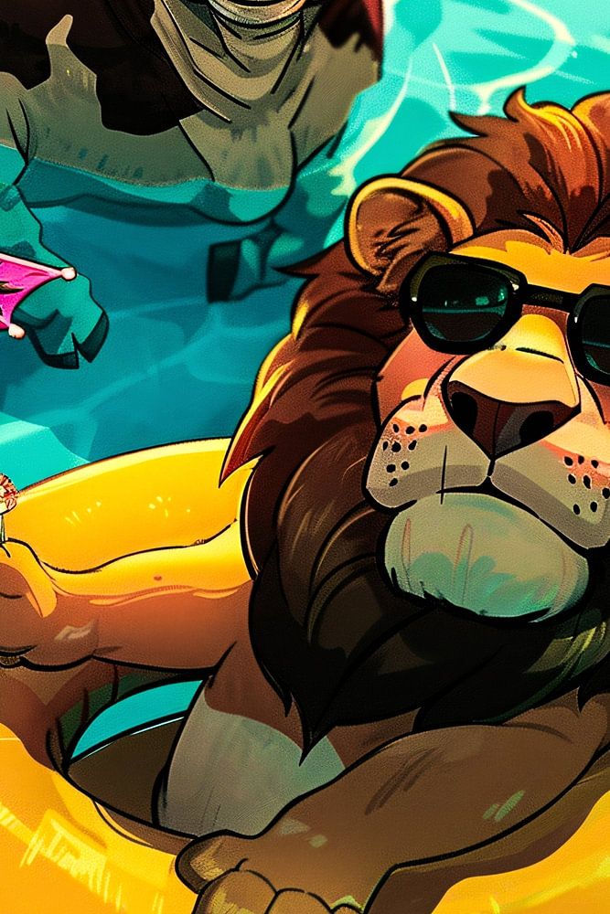 This cheerful design transports you to a summer day where a relaxed lion and a playful cow enjoy a dip in the pool together. The lion, complete with sunglasses and a refreshing drink, floats on an inflatable tyre, while the cow happily explores the water. This colourful and humorous scene combines vibrant colours with a modern digital art style. Perfect as a decoration in a room that could use a playful and dynamic look. The design exudes fun, relaxation and a bit of summer humour. Ideal for lovers of animals and creative art!