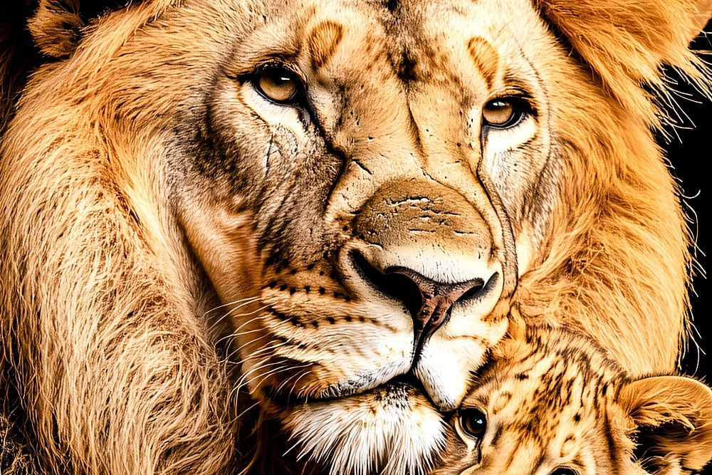 This impressive artwork captures the powerful moment of a lion and its cub. The intense aura of the lion, with its majestic mane, is beautifully captured against the dark background. The cub, soft and playful, leans against his father's strength, evoking a sense of security and love. The details in the fur, especially the yellow and brown tones that mingle, bring the animals to life. This artwork is perfect for those who want to capture the power of nature and the bond between parent and child in an intimate and impressive portrait.