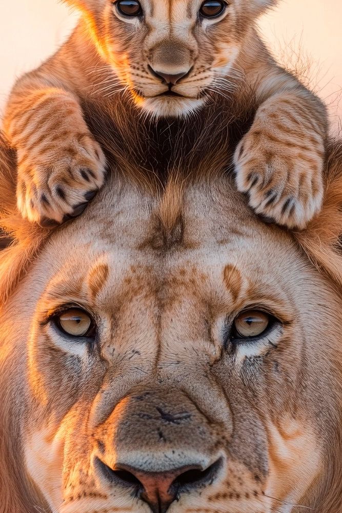In the gentle morning warmth, the majestic lion and curious lion cub stand in perfect harmony. The soft light frames the proud face of the father and emphasises the playful features of the cub, who is enthroned in a safe place. A touching image of strength and tenderness that celebrates the bond between generations.