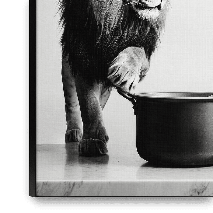 A majestic lion with an impressive mane bends over a plain black cooking pot. The high-contrast black and white image lends the picture an elegant, timeless touch. This fascinating combination of power and culinary art makes it an eye-catcher in the modern kitchen and inspires creative cookery adventures.