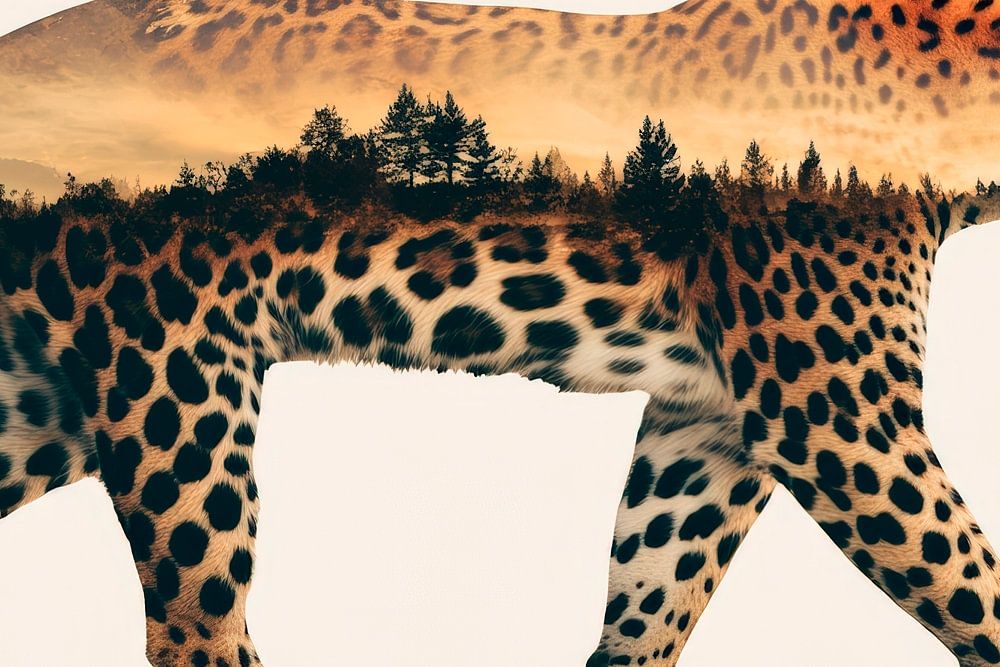 A fascinating leopard outline, filled with a picturesque landscape, draws the viewer into its mysterious world. The harmonious interplay of animal and nature symbolises freedom and adventure, perfect for a living room or a creative office. Here, every glance becomes a discovery of new horizons!