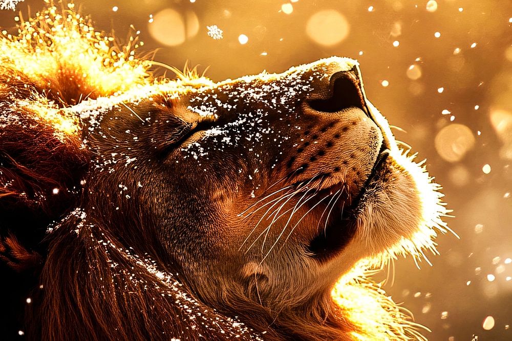 This breathtaking design captures the strength and elegance of a lion as it enjoys a winter snowfall. The warm golden tones of the background contrast beautifully with the cold snowflakes subtly falling on his majestic mane. Perfect for a modern living room or bedroom, this artwork exudes strength, tranquillity and natural beauty. A perfect choice for animal and nature lovers!