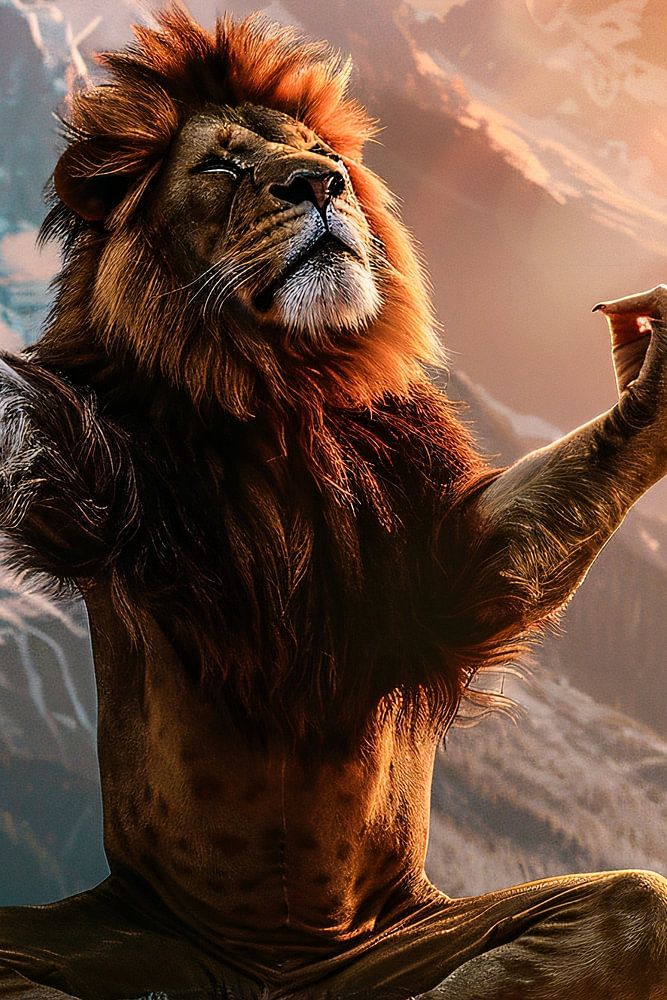 A unique combination of nature and fantasy. This design depicts a majestic lion meditating in a serene yoga pose on a mountaintop. Surrounded by breathtaking mountains and a colourful sunset, the design exudes tranquillity, strength and mysticism. Perfect as a decoration piece for lovers of animals, nature or spiritual art. This image can add a soothing atmosphere to any room.