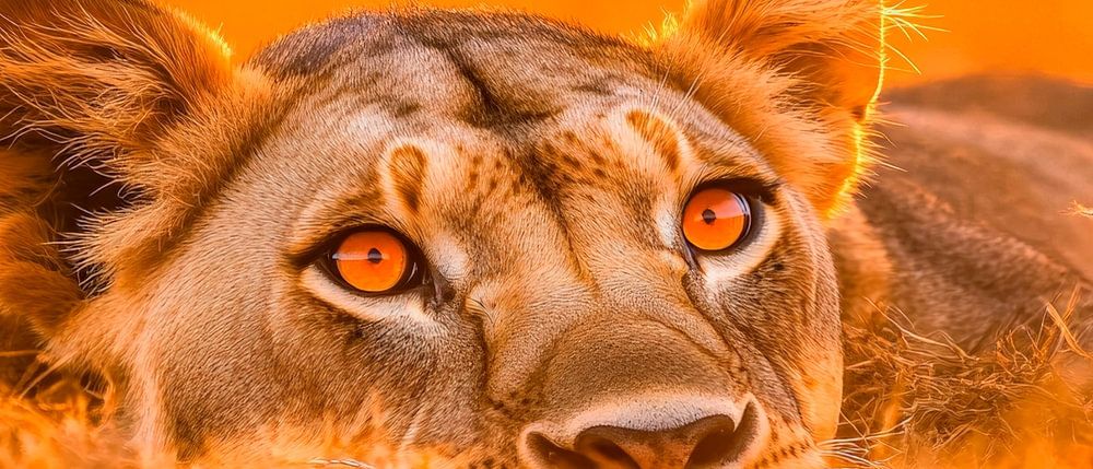 The golden hour brings majestic beauty to life, while the soft, warm colour tones draw the patient Lion's gaze down to the grasslands. This captivating portrait of a queen of the savannah adds a touch of wilderness and elegance to any living room, inviting contemplation and meditation.