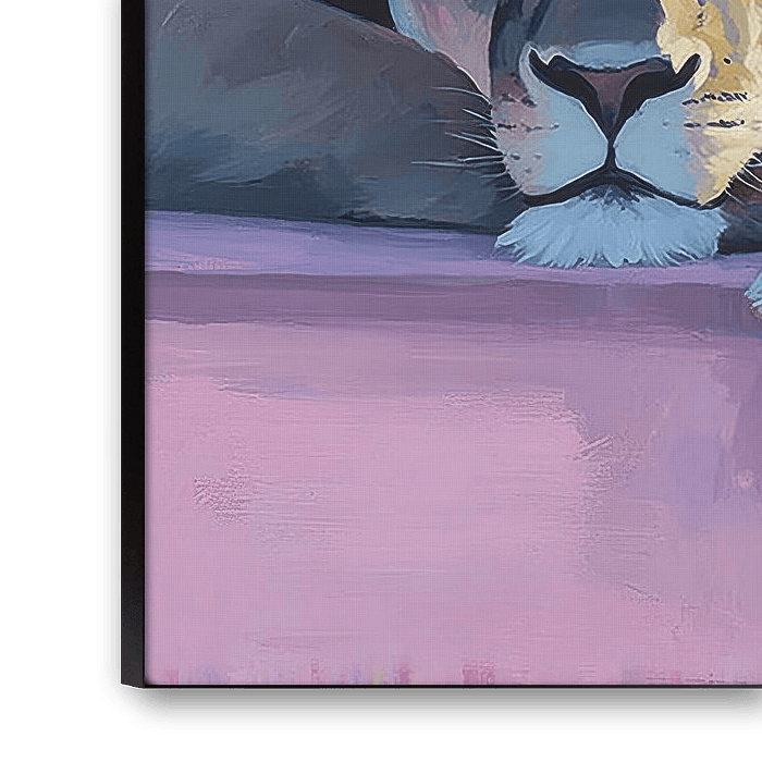 This realistic painting shows a lioness lying on a flat, light purple surface. The head is resting on the surface, the front paws are stretched forwards and the gaze is focussed forwards. The coat is predominantly grey with lighter accents on the face and chest, the eyes glow green. The background is a monochrome light purple, making the lioness the clear centre of the composition. Soft, directional lighting and visible brushstrokes emphasise the fur texture and subtle shadows, giving the figure a three-dimensional and lively appearance. The calm, minimalist depiction makes the lioness appear impressive and elegant.