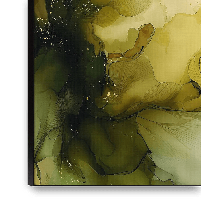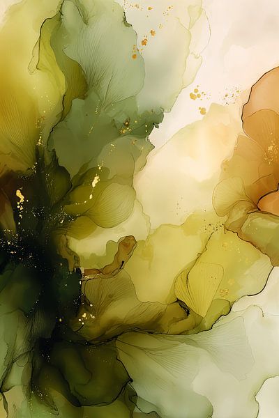This artwork plays with fluid forms and a delicate color palette of soft green, gold, and cream. The organic movements evoke natural elements—petals, water, and light—while flecks of gold add a touch of mystique and luxury. A harmonious dance between structure and chaos that transports the viewer to a dreamy, contemplative adventure.