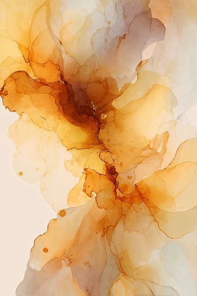 A captivating abstract watercolor work where gold tones and warm amber hues blend organically. The transparent layers create a dreamy movement of light and shadow, as if you were watching dissolving clouds or liquid honey spreading. This layered masterpiece exudes tranquility and elegance, perfect for those seeking an escape to a warm,…