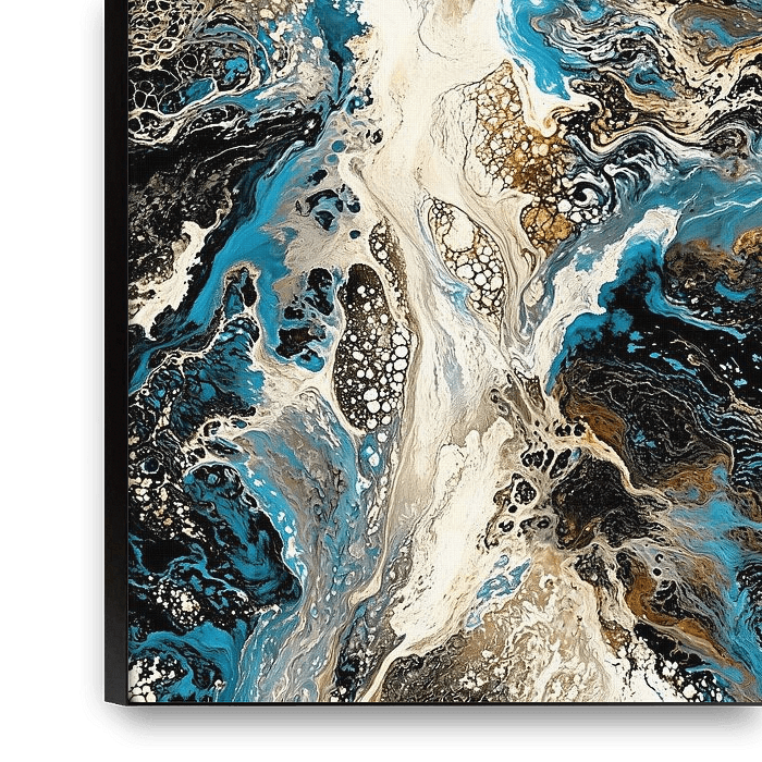 A beautiful abstract artwork created using the fluid art technique. This piece combines deep turquoise tones with warm gold and ochre, creating a dynamic and luxurious contrast. The organic cells and flowing lines are reminiscent of an abstract seascape or precious minerals. This painting brings a modern, calming energy to any interior…