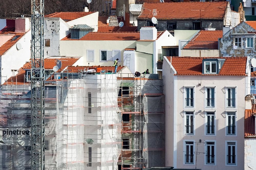 Lisbon, Portugal. Cityscape. Houses in the sun. Green house, pink colors. Colored city view. View during vacation. Travelling in Europe.