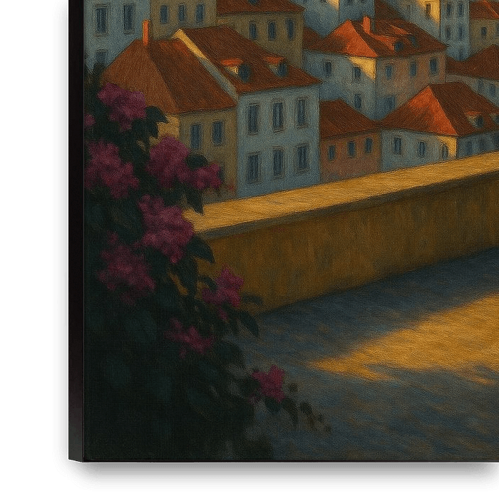 Capturing a breathtaking panoramic view over the historic Alfama district, this painting showcases Lisbon's characteristic terracotta rooftops and the grand architecture of its hillside churches. Framed by the lush pink of bougainvillea and the geometric pattern of azulejo tiles on a sun-drenched column, the eye is drawn across a sea of…