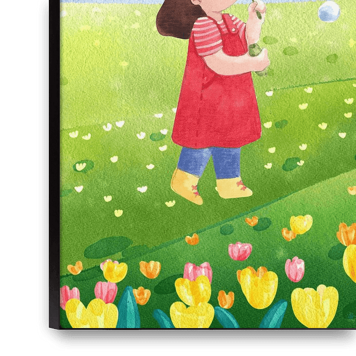 Buy this digital art artwork Little Girl Blowing Bubbles in a Flower Field by Geovia as a reproduction on canvas, ArtFrame, poster and wallpaper, printed on demand in high quality.