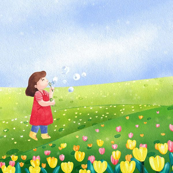 This artwork shows a joyful scene of a little girl standing in a wide green field, gently blowing soap bubbles into the air. She is surrounded by soft rolling hills and colorful flowers, painted in warm shades of yellow, pink, and green. The open blue sky creates a feeling of space and freedom, while the floating bubbles add a playful…