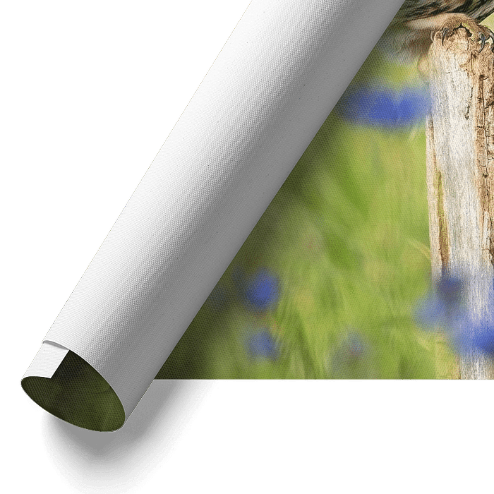 Little owl on a tree trunk amidst the colored wildflowers like the blue purple cornflowers